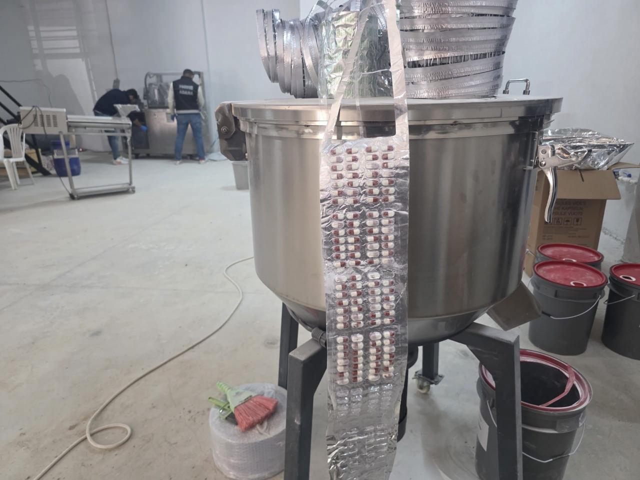 Yapılan aramalarda 262 bin 473 uyuşturucu hap, 1 blister hazırlama makinesi, 1 kapsül doldurma makinesi, 1 kapsül temizleme makinesi, 1 karıştırma makinesi, 1 jeneratör, 2 kompresör makinesi, 3 milyon uyuşturucu hap yapabilecek 833 kilo 500 gram hammadde, 25 kilogram katkı maddesi, 972 bin boş kapsül ve çeşitli plastik malzemeler ele geçirildi.