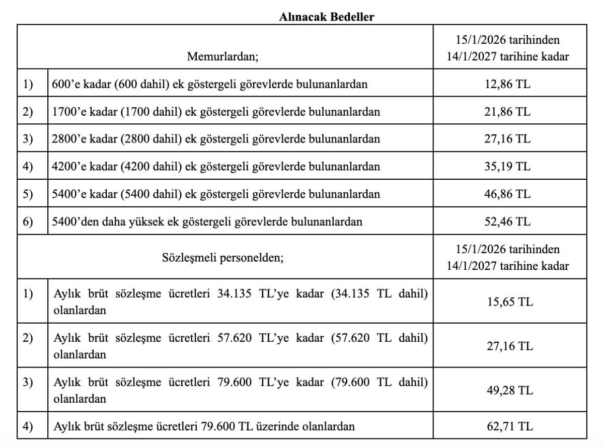 Tebliğe göre, 15 Ocak 2026’dan itibaren öğle yemeği servisinden faydalanacak memurlardan günlük 12,86 TL ile 52,46 TL arasında yemek bedeli alınacak. Ek göstergeye göre belirlenen ücretler şu şekildedir: