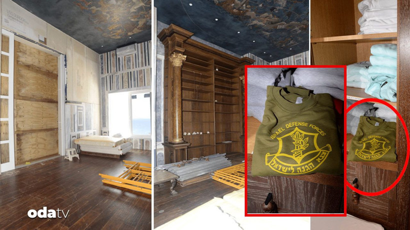 İçerisi yüksek tavanlı, duvarlardaki yoğun mermer kullanımı dikkat çekiyor. Koyu renkteki kitaplık görünümlü mobilya ise boş. Öte yandan diğer odalardan birinde İsrail Ordusu’na ait bir tişört görülüyor.